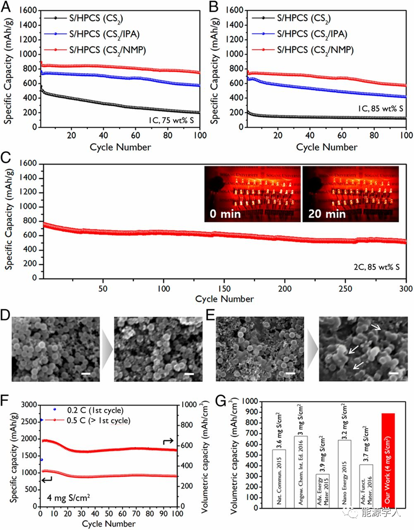 圖5(A和B)S/HPCS(CS2)、S/HPCS(CS2/IPA)和S/HPCS(CS2/NMP)電池的循環(huán)性能。(C)硫含量為85%的S/HPCS(CS2/NMP)電池在2 C下的循環(huán)性能。(D)S/H-PCS(CS2/NMP)電極和(E)S/H-PCS(CS2)電極50次循環(huán)前后的SEM圖像。(F)S/HPCS(CS2/NMP)電極在0.5 C下的比容量和容量。(G)實驗結果與使用類似硫負載的最新結果的比較。