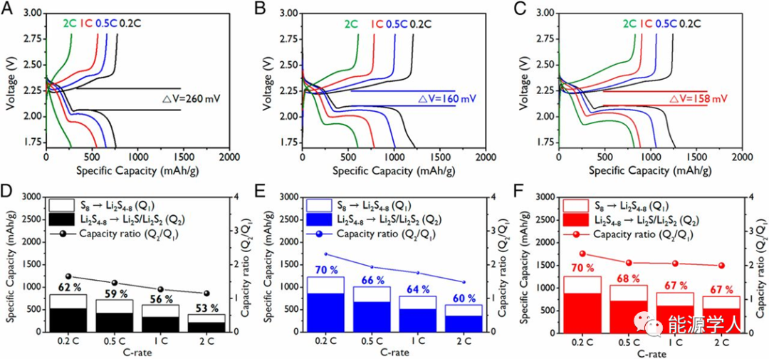 圖4(A)S/HPCS(CS2),(B)S/HPCS(CS2/IPA)和(C)S/HPCS(CS2/NMP)正極的充放電曲線;(D-F)長鏈多硫轉換(Q1)和短鏈多硫轉換(Q2)的容量貢獻以及在不同倍率下的Q2/Q1比。