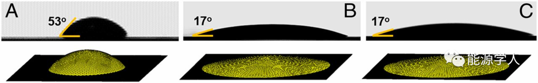 圖2接觸角和每個溶液滴碳表面潤濕的模擬圖像。