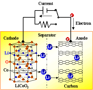 一個電源給電池充電,此時正極上的電子e從通過外部電路跑到負(fù)極上,正鋰離子Li+從正極“跳進”電解液里,“爬過”隔膜上彎彎曲曲的小洞,“游泳”到達(dá)負(fù)極,與早就跑過來的電子結(jié)合在一起。