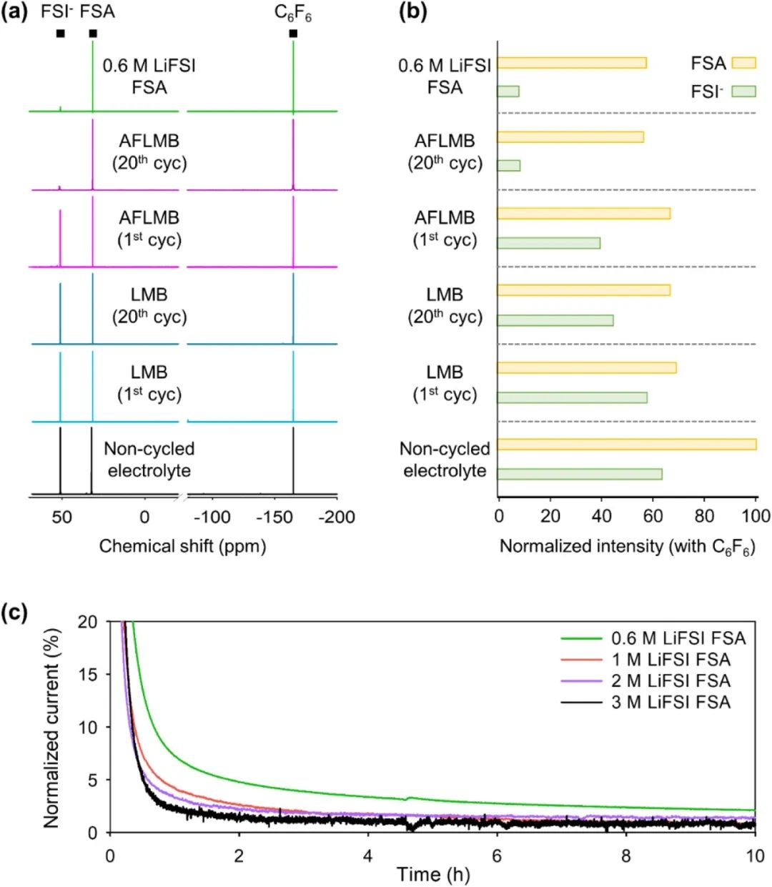 圖3. (a) 0.6 M LiFSI FSA 電解質(zhì)、非循環(huán)電解質(zhì)、AFLMB 和 LMB 與 3 M LiFSI FSA 電解質(zhì)經(jīng)過 1 個(gè)和 20 個(gè)循環(huán)后的 19F NMR 光譜。(b) 19F NMR 光譜中 FSI 陰離子和 FSA 溶劑峰的綜合面積,使用 (a) 19F NMR 光譜中 C6F6 的內(nèi)部參考進(jìn)行歸一化。(c) Cu/NCM811 電池在 25 °C預(yù)循環(huán)后,在 4.25 V 下進(jìn)行的電化學(xué)浮動測試。