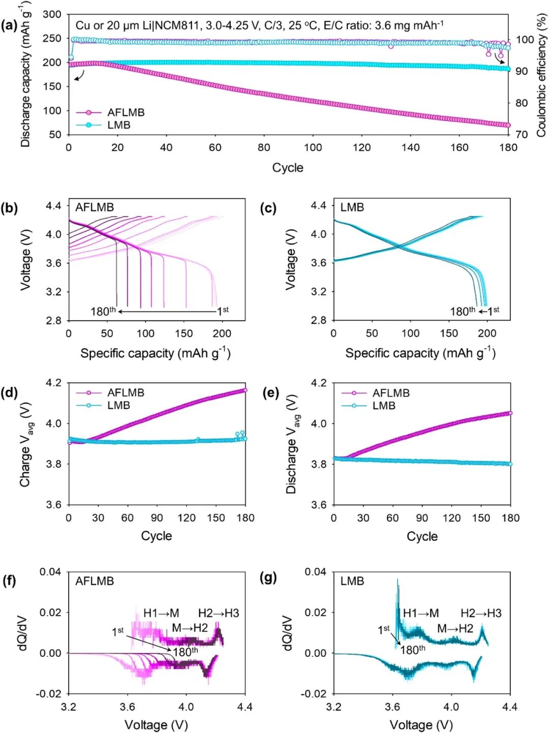 圖2. (a) AFLMB 和 LMB 在紐扣電池中的循環(huán)穩(wěn)定性。使用 3 M LiFSI FSA 電解質(zhì)的 AFLMB 和 LMB 在循環(huán)過程中(b)的電壓曲線。AFLMB 和 LMB (d) 充電和 (e) 放電曲線的平均電壓。(f) AFLMB 和 (g) LMB 超過 180 個(gè)循環(huán)的 dQ/dV 圖。