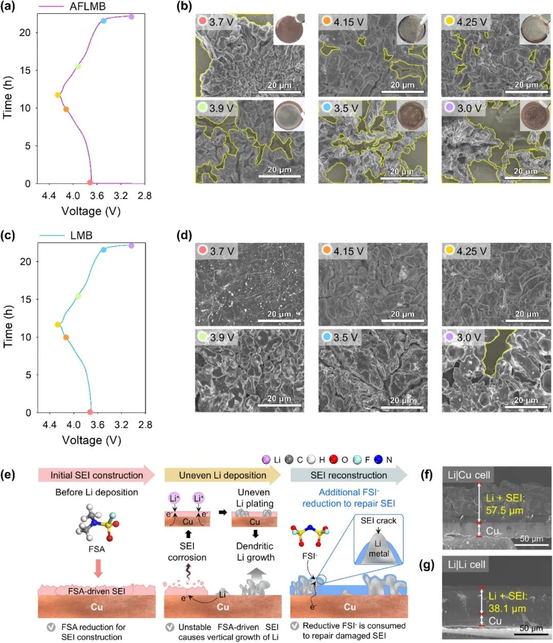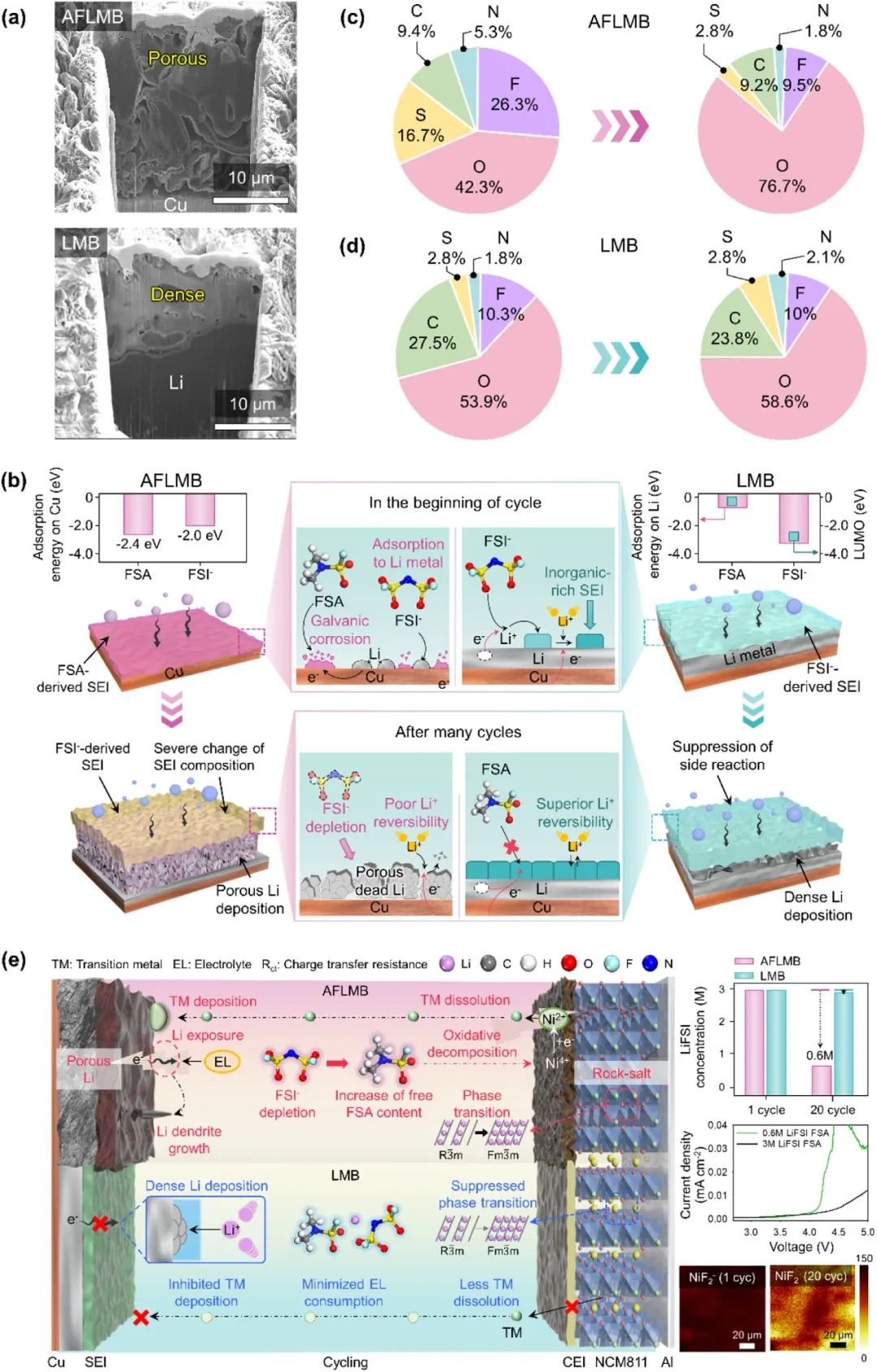 圖1. (a) 銅箔和鋰金屬陽極鍍鋰后的截面 SEM 圖。(b) 根據(jù)最低未占分子軌道(LUMO)能級以及 FSA 溶劑和 FSI-陰離子在 Cu 和鋰金屬上的吸附傾向的結(jié)果,Cu 銅箔和鋰金屬陽極在第一個(gè)周期鍍鋰前后 SEI 成分的變化示意圖。XPS 分析得出的原子百分比:(c) AFLMB 中的銅箔和 (d) LMB 中的鋰金屬陽極,在 AFLMB 首次充電期間,鍍鋰前充電至 3.7 V 和鍍鋰后充電至 4.25 V 時(shí)的對比。(e)通過比較分析(循環(huán)過程中 LiFSI 濃度的變化、LSV 和 TOF-SIMS 圖像)發(fā)現(xiàn),使用 3 M LiFSI FSA 電解液的 AFLMB 和 LMB 的界面現(xiàn)象存在差異。
