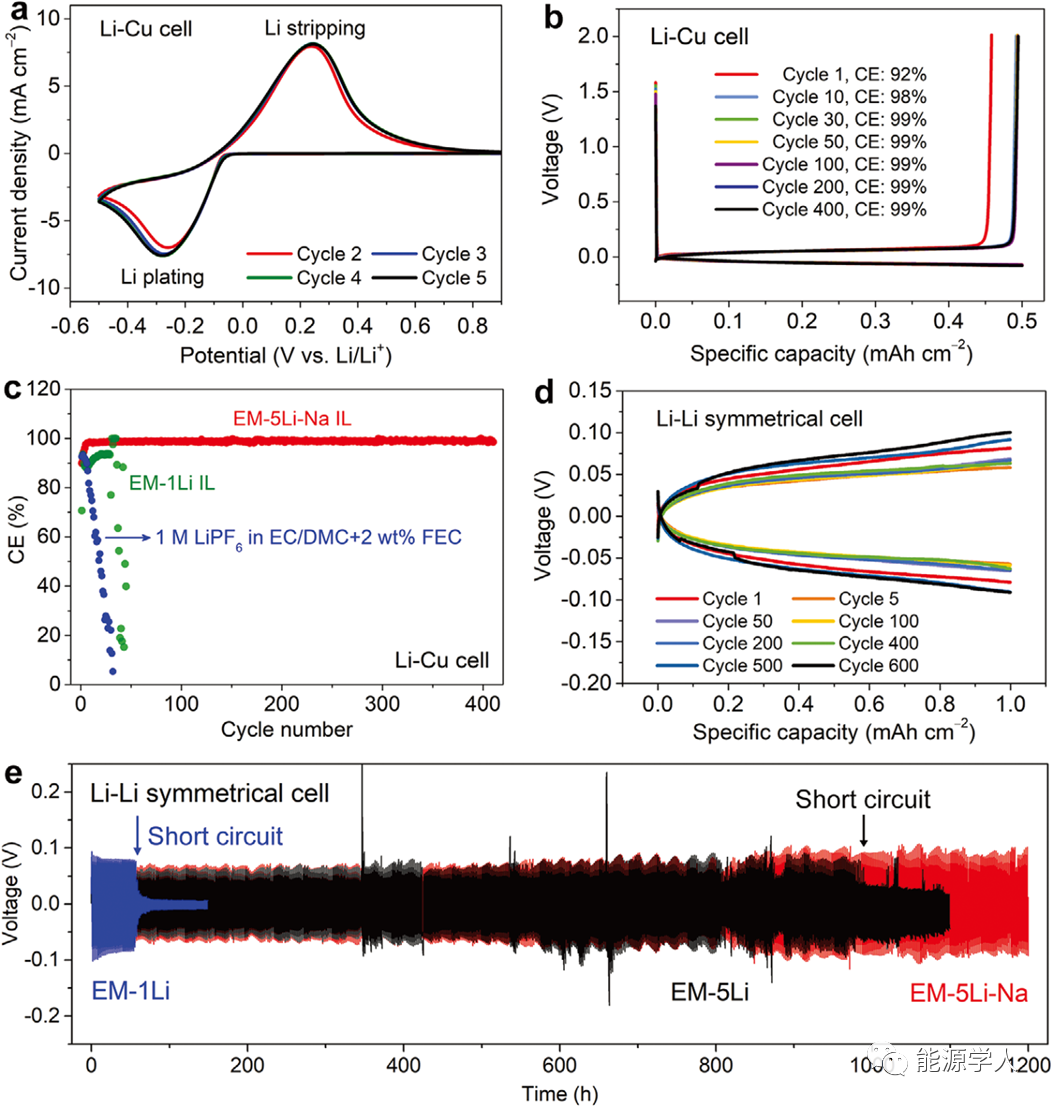采用EM-5Li-Na IL電解液組裝Li-Cu電池,由其循環(huán)伏安曲線可知(圖2a),Li的沉積/溶解顯示出高可逆性。對該電池進行恒流充放電測試(電流密度0.5 mA cm-2,Li金屬沉積容量0.5 mAh cm-2)。結(jié)果表明,在SEI形成的前10個循環(huán)中,CE從92%增至98%,在之后的400多個循環(huán)中基本穩(wěn)定在≈99%(圖2b,c),遠遠超過其他Li基IL電解質(zhì)。組裝Li/Li對稱電池在恒定電流密度1 mA cm-2和恒定容量1 mAh cm-2下進行充放電測試,其在EM-5Li-Na IL電解質(zhì)中循環(huán)1200 h時,極化略有增加(圖2d,e),但小于其在 EM-1Li和不含NaTFSI添加劑的EM-5Li IL電解質(zhì)中的極化(圖2e)。作者認為這與不同電解質(zhì)中Li的沉積形態(tài)有關(guān)。例如,在有機和EM-1Li IL電解液中可以觀察到銅箔上的樹枝狀Li鍍層,導(dǎo)致形成“死鋰”,最終導(dǎo)致短路和較差的循環(huán)穩(wěn)定性。相反,在EM-5Li-Na IL電解質(zhì)中觀察到密集堆積的Li顆粒,沒有明顯的樹突形態(tài)。