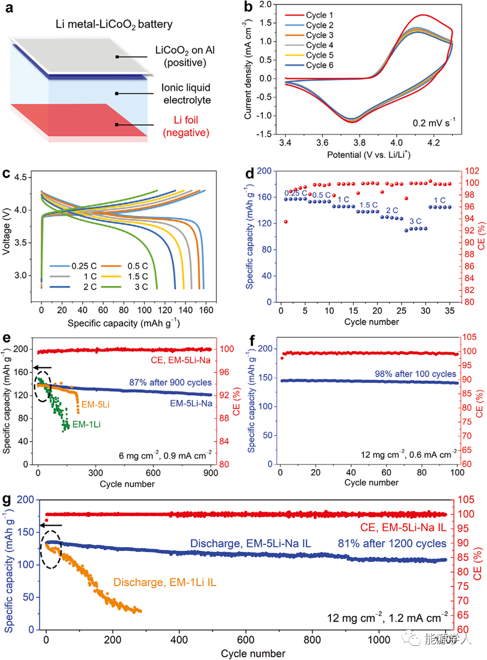 圖3 采用EM-5Li-Na - IL電解液的Li-LiCoO2電池的電化學性能。a) Li-LiCoO2電池結(jié)構(gòu)示意圖。b)采用 EM-5Li-Na IL電解液的Li-LiCoO2電池的CV曲線,掃描速率為2mv s?1。c) 使用EM-5Li-Na IL電解液的Li-LiCoO2電池在不同倍率下(0.25-3 C)的恒流充放電曲線。d) 使用EM-5Li-Na IL電解液的Li-LiCoO2電池的倍率性能。(b-d)中LiCoO2的載量為≈6 mg cm?2。e) 使用EM-1Li、EM-5Li和EM-5Li-Na IL電解液的Li-LiCoO2電池在1 C下的循環(huán)穩(wěn)定性曲線,LiCoO2的載量為≈6 mg cm?2。f)使用EM-5Li-Na IL電解液的Li - LiCoO2電池在0.35 C下的循環(huán)性能曲線,LiCoO2的載量為≈12 mg cm?2。g)分別采用EM-1Li和EM-5Li-NaIL電解液時Li-LiCoO2電池的循環(huán)性能曲線,LiCoO2的載量為≈12 mg cm?2,所有電池先在0.25 C下循環(huán)2次,隨后在0.7 C(≈1.2 mA cm?2) 下進行循環(huán)性能比較。