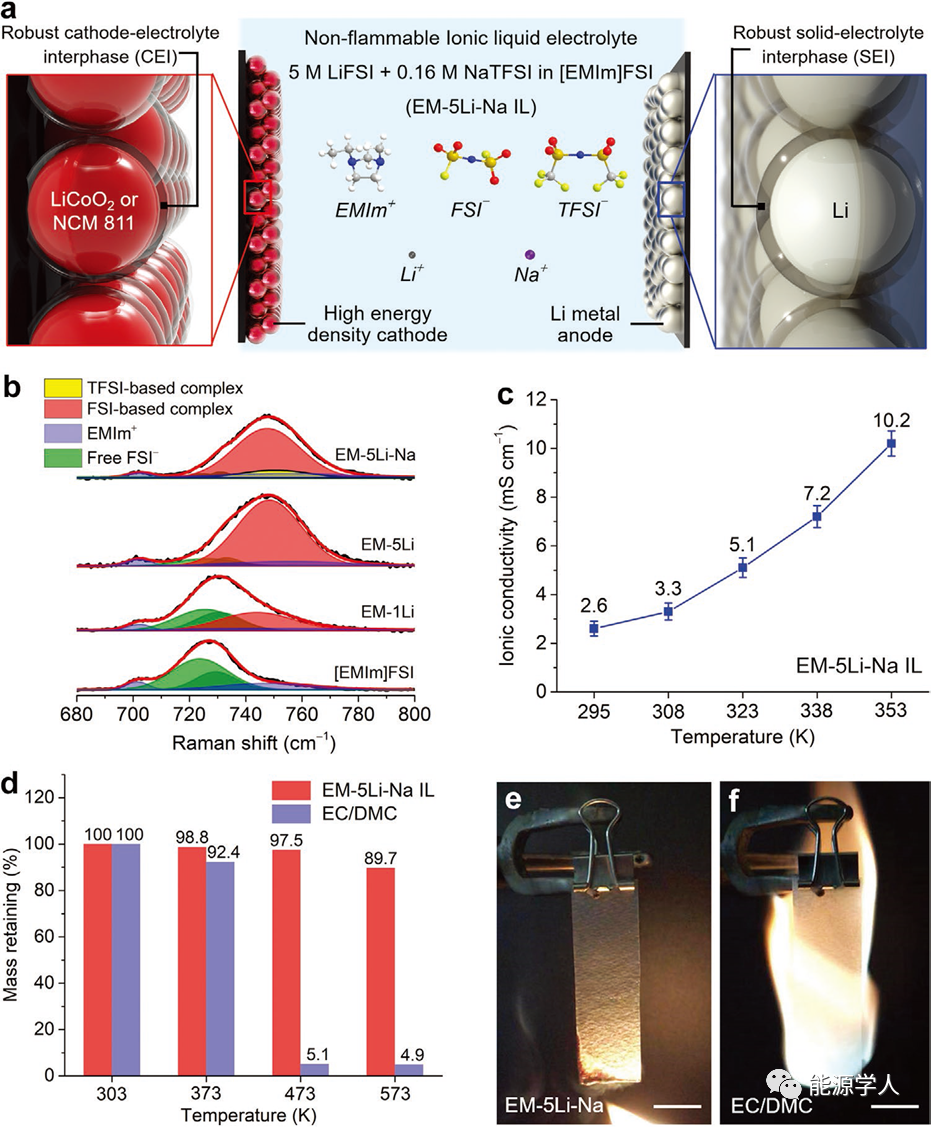 圖1 不易燃離子液體電解液的特性。a) EM-5Li-Na IL電解液的組成與電池結(jié)構(gòu)示意圖。b)純[EMIm]FSI、EM-1Li、EM-5Li和EM-5Li-Na ILs的拉曼光譜。c) EM-5Li-Na IL在不同溫度下的離子電導(dǎo)率。d) EM-5Li-Na IL電解液與常規(guī)有機電解液(1 M LiPF6-EC/DMC, 1:1 vol)的熱穩(wěn)定性分析。e,f) EM-5Li-Na IL電解液(e)傳統(tǒng)1 M LiPF6-EC/DMC有機電解液(f)的易燃性測試