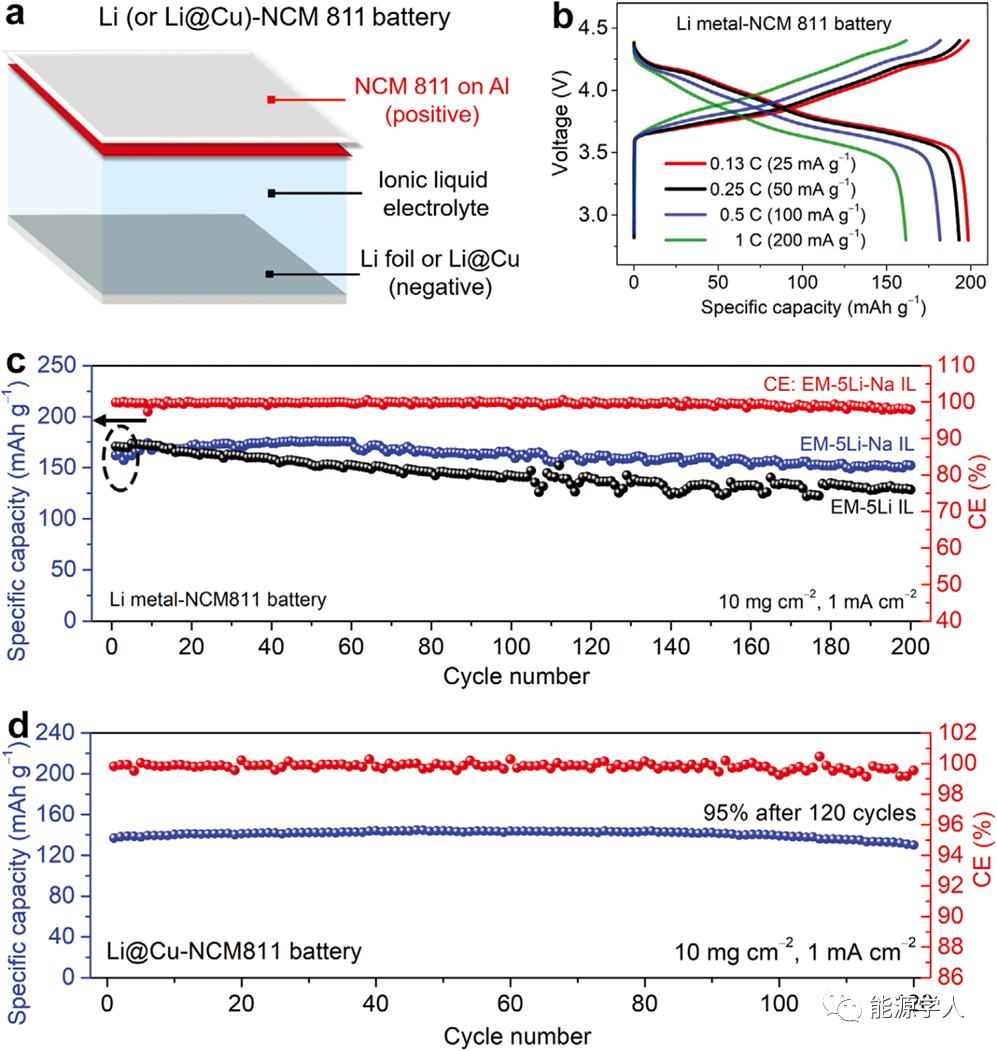 圖5 采用EM-5Li-Na-IL電解液的NCM811基鋰金屬電池。a) NCM811基鋰金屬電池結(jié)構(gòu)示意圖,負極為Li金屬或Li@Cu。b) NCM811基鋰金屬電池不同倍率下(0.25-1 C,25-200 mA g-1)的恒流充放電曲線。c) 分別使用EM-5Li和EM-5Li-NaIL電解液的Li-NCM811電池在0.5 C下的循環(huán)穩(wěn)定性。(b-c)中的比容量均基于NCM811的質(zhì)量。d) 使用EM-5Li-Na IL電解液的Li@Cu-NCM811電池在0.5 C下的的循環(huán)穩(wěn)定性。所沉積Li金屬的容量約1.8倍過量。(d)中比容量基于正、負極總質(zhì)量。(a-d)中NCM811的載量為≈10 mgcm?2。