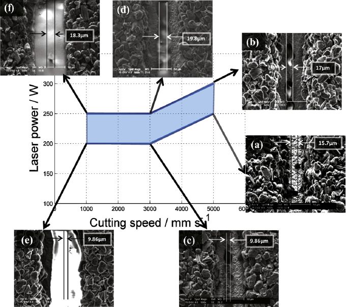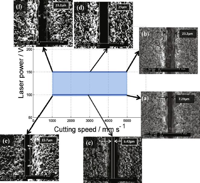 其中,激光能量和切割移動速度是兩個主要的工藝參數(shù),對切割質(zhì)量影響巨大。圖5是不同的激光切割工藝條件下單面涂層負(fù)極極片的切邊形貌,圖6是不同的激光切割工藝條件下單面涂層正極極片的切邊形貌。當(dāng)激光功率太低或者移動速度太快時,極片不能完全切開,而當(dāng)功率太高或移動速度太低時,激光對材料作用區(qū)域變大,切縫尺寸更大。