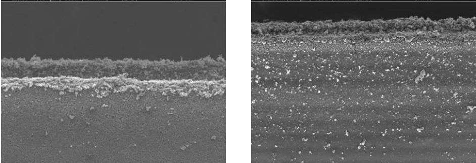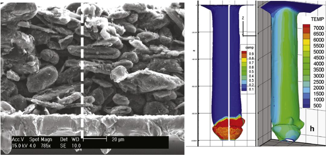 由于鋰離子電池極片是雙面涂層+中間集流體金屬層的結(jié)構(gòu),而且涂層與金屬箔材之間性質(zhì)差異大,對激光作用的響應(yīng)也不相同。激光作用在負(fù)極石墨層或正極活物質(zhì)層時,由于它們具有很高的激光吸收率,導(dǎo)熱系數(shù)也很低,因此,涂層需要相對較低的熔化和汽化激光能量,而金屬集流體對激光具有反射作用,并且熱傳導(dǎo)快,因此金屬層的熔化和汽化激光能量升高。圖7是單面涂層的負(fù)極在激光作用下極片厚度方向的銅成分和溫度分布,當(dāng)激光作用在石墨層時,由于材料的特性,石墨主要發(fā)生汽化,當(dāng)激光侵入到金屬銅箔時,銅箔開始發(fā)生熔化,形成熔池。工藝參數(shù)不合適時,可能出現(xiàn)問題:(1)切邊涂層脫落,露出金屬箔材,如圖8左圖所示;(2)切邊周圍出現(xiàn)大量切屑異物。這些都會導(dǎo)致電池出現(xiàn)性能下降、安全性品質(zhì)問題,如圖8右圖所示。因此,當(dāng)采用激光切割時,需要根據(jù)活物質(zhì)材料和金屬箔材的特性,優(yōu)化合適的工藝參數(shù),才能既完全切割極片,又形成良好的切邊質(zhì)量,不產(chǎn)生金屬切屑雜質(zhì)殘留。