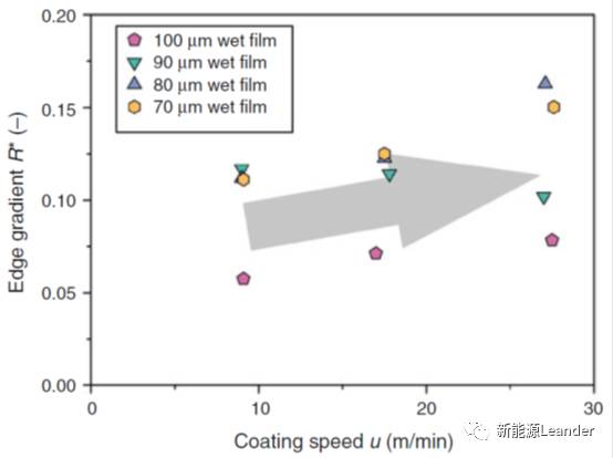 Marcel Schmitt等人鋰離子電池負(fù)極漿料涂布工藝實(shí)驗(yàn)研究發(fā)現(xiàn),涂布速度對(duì)厚邊的無(wú)量綱厚度和寬度幾乎沒(méi)有影響,而會(huì)影響厚邊的梯度特征R*,當(dāng)涂布速度增加時(shí),R*相應(yīng)增加,即厚邊緣厚度變化更尖銳,如圖5所示。