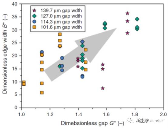 式中,q為漿料體積流量,H為涂層濕厚,G為涂布間隙。因此,厚邊涂層厚度與無(wú)量綱涂布間隙G*相關(guān)。